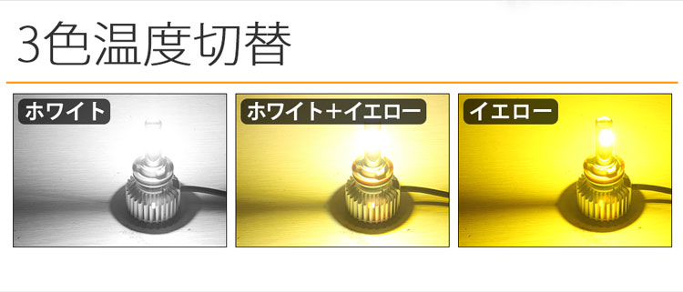 今、大注目!!イチ押し商品!! アイテム情報 商品仕様 消費電力:28W (二面発光) LED種類:COBチップ搭載 ソケット:H4 Hi/Lo 動作電圧:12V対応 ハイブリッド車対応 発 光 色 :昼光色 / 昼白色 / 電球色 ルーメン:2100LM(片方) 動作温度:-40℃-+150℃ 製品寿命:約30,000時間 放熱原理:冷却ファン+熱伝導に優れたアルミ材質ヒートシンク機能 本体材質:アルミ合金 防水等級:IP 67 商品ポイント 1.【次世代の2色3モード切替るLEDヘッドライト/フォグランプ】天候に合わせて色温度が切替えできます!雪、雨、霧など悪天候には3000Kの色温度が非常に必要です。