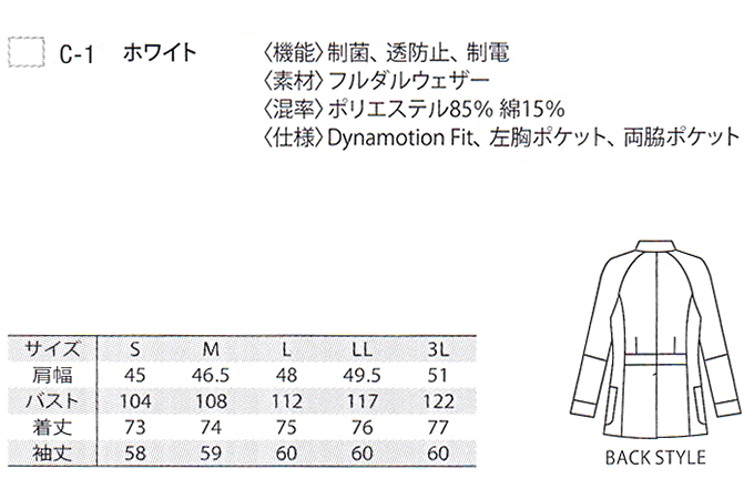 ■商品名:ハーフコート(男性用)■サイズ展開:S〜3L■カラー展開:ホワイト■素材:フルダルウェザー■混率:ポリエステル85% 綿15%■仕様:Dynamotion Fit、左胸ポケット、両脇ポケット■機能:制菌、透防止、制電Size Information S:肩幅 45cm/バスト 104cm/着丈 73cm/そで丈 58cm M:肩幅 46.5cm/バスト 108cm/着丈 74cm/そで丈 59cm L:肩幅 48cm/バスト 112cm/着丈 75cm/そで丈 60cm LL:肩幅 49.5cm/バスト 117cm/着丈 76cm/そで丈 60cm 3L:肩幅 51cm/バスト 122cm/着丈 77cm/そで丈 60cmチェスターコート風 ドクターコート MZ-0025 七分袖ドクターコート(女性用)MZ-0024 ショートジャケット(女性用) MZ-0055 ショートジャケット(男性用) MZ-0056
